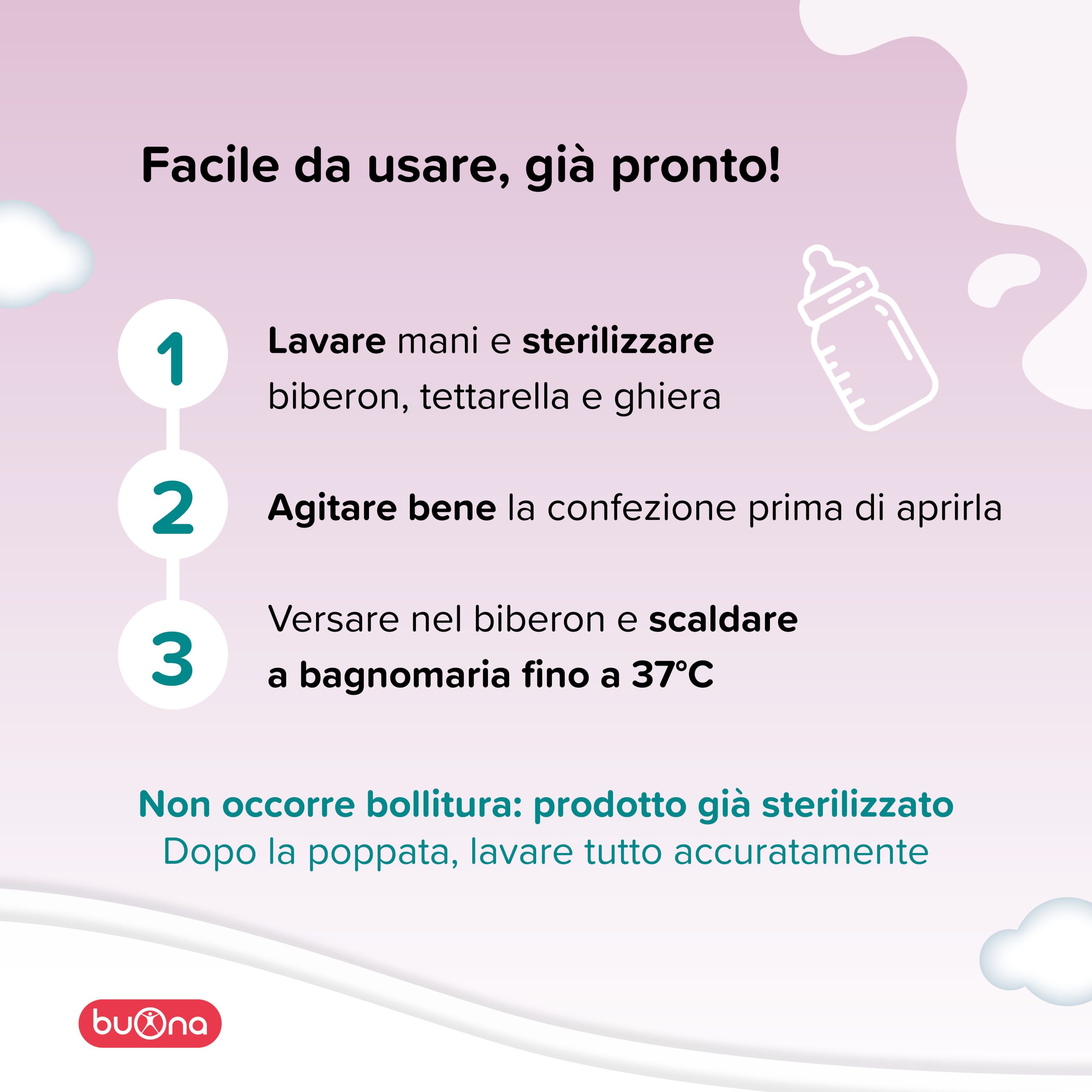 - Prima della preparazione lavare e asciugare accuratamente le mani e sterilizzare biberon, tettarella e ghiera;