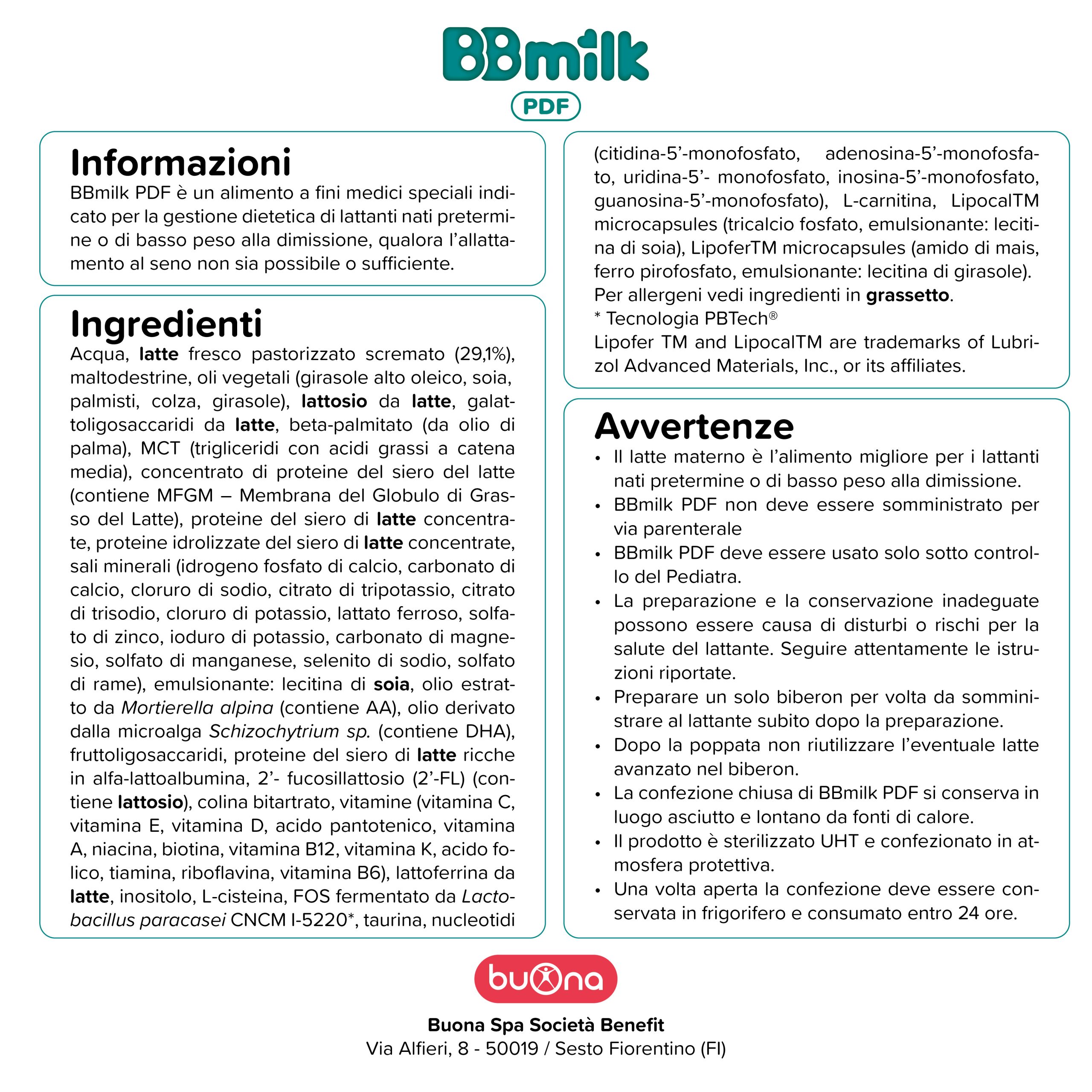 BBmilk PDF è idoneo ad essere utilizzato come unica fonte di nutrimento dei lattanti nati pretermine o di basso peso alla dimissione. La formulazione di BBmilk PDF è in grado di soddisfare gli specifici fabbisogni nutrizionali di questi lattanti, grazie alla sua elevata densità calorica e al suo alto contenuto proteico, al quale contribuiscono le proteine del siero di latte ricche in alfa-lattoalbumina e la lattoferrina. Contiene, inoltre, MFGM (Membrana del Globulo di Grasso del Latte), beta-palmitato, galattoligosaccaridi (GOS) e fruttoligosaccaridi (FOS) ed è integrata con 2’-fucosillattosio (HMO), nucleotidi e acidi grassi essenziali polinsaturi a catena lunga.