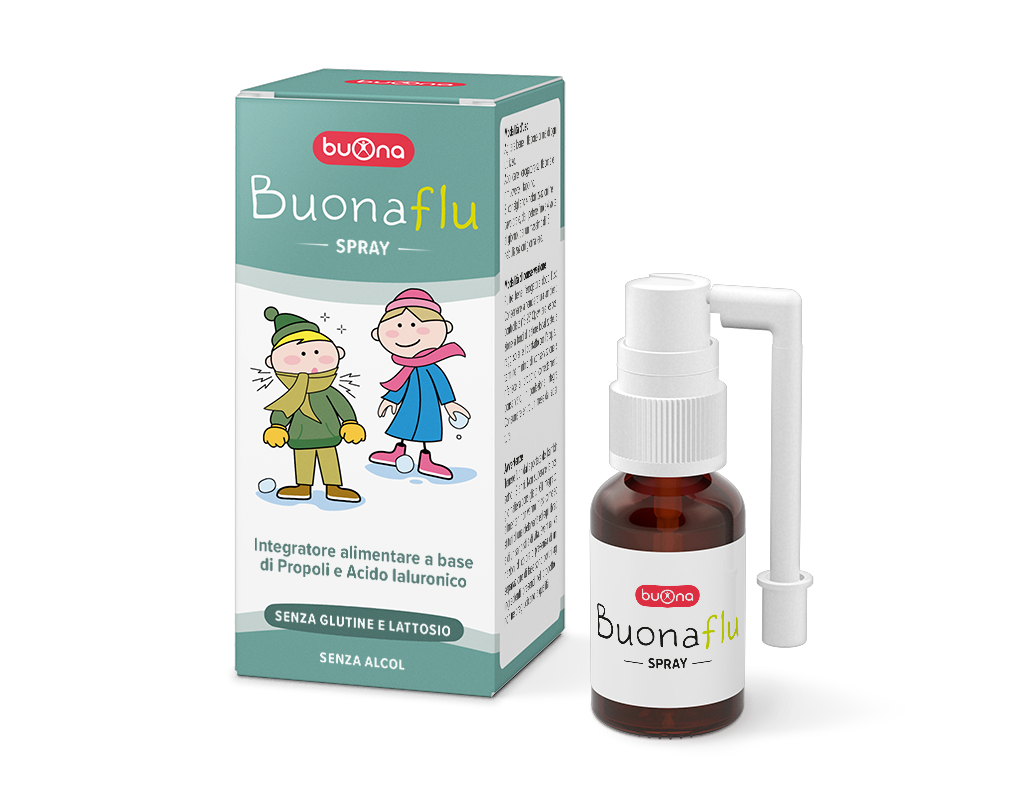 Buonaflu Spray è un integratore alimentare a base di Propoli e Acido Ialuronico, sviluppato per il benessere della gola.